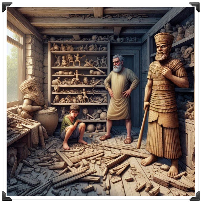 When my Dad returns, he’s furious. “What the hell happened here??” he screams at me. I tell him a woman came to make a food offering to the idols, but the idols argued about which one should eat the offering first — and a fight broke out. Brutus had a huge size advantage and a wooden club, so he smashed all the other idols to pieces.
