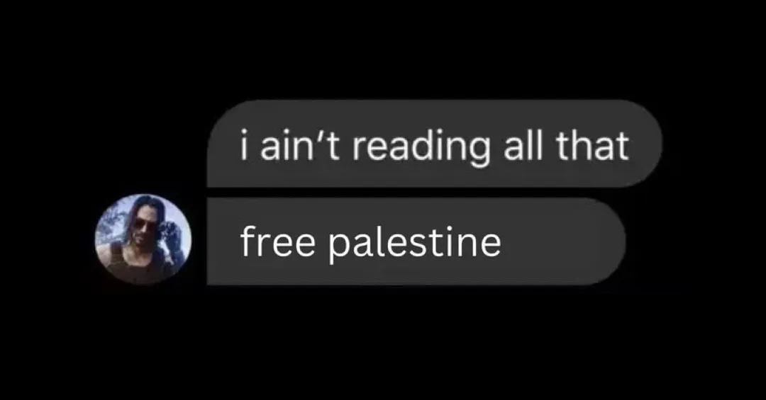 Not: “I ain’t reading all that. Stop funding Israel’s war machine.”