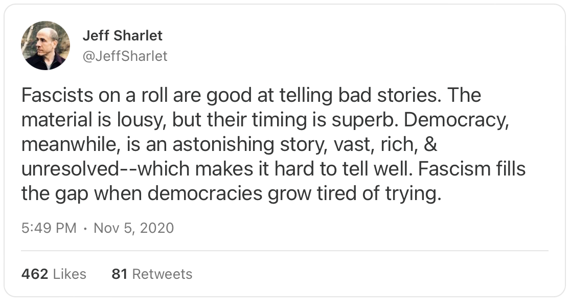 Or consider the Americans who deny the documented result of the 2020 election: Trump lost. The courts rejected all claims of alleged voting irregularities, yet an angry mob still stormed the U.S. Capitol demanding the loser be crowned the winner — and that Vice President Mike Pence be lynched. Four years later there’s still no closure, so the story “‘spreads over the landscape like a stain,’ infecting the culture with a mixture of sorrow, depression, and impotent rage.” Which is fertile ground for demagogues and fascists.