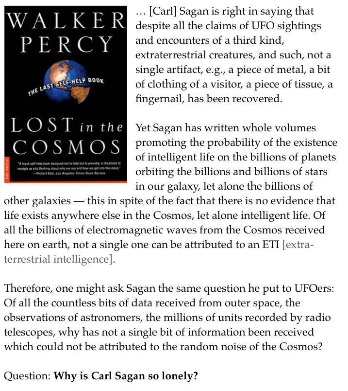 Carl Sagan and Walker Percy Carl Sagan was a brilliant astronomer, a gifted science communicator, and a man on a mission.